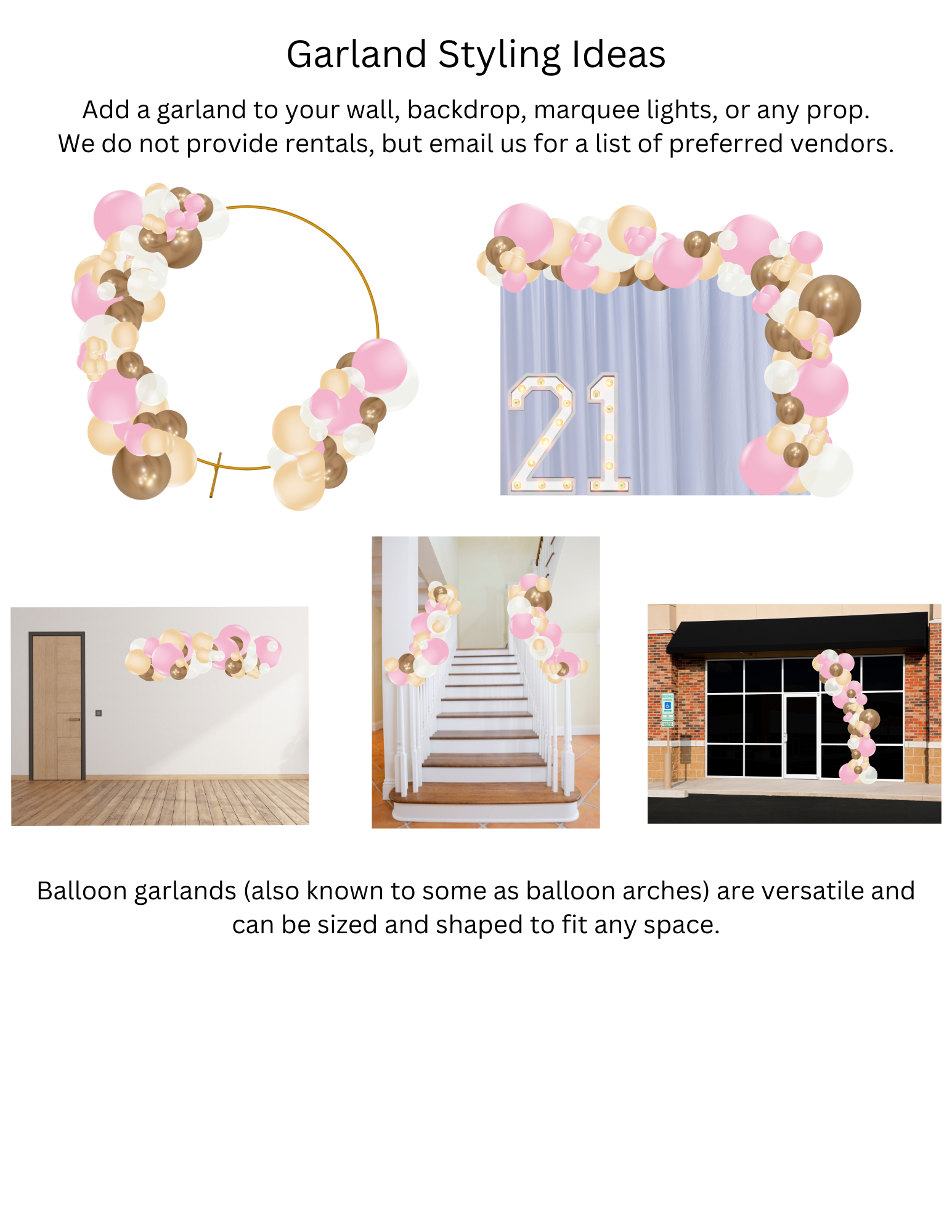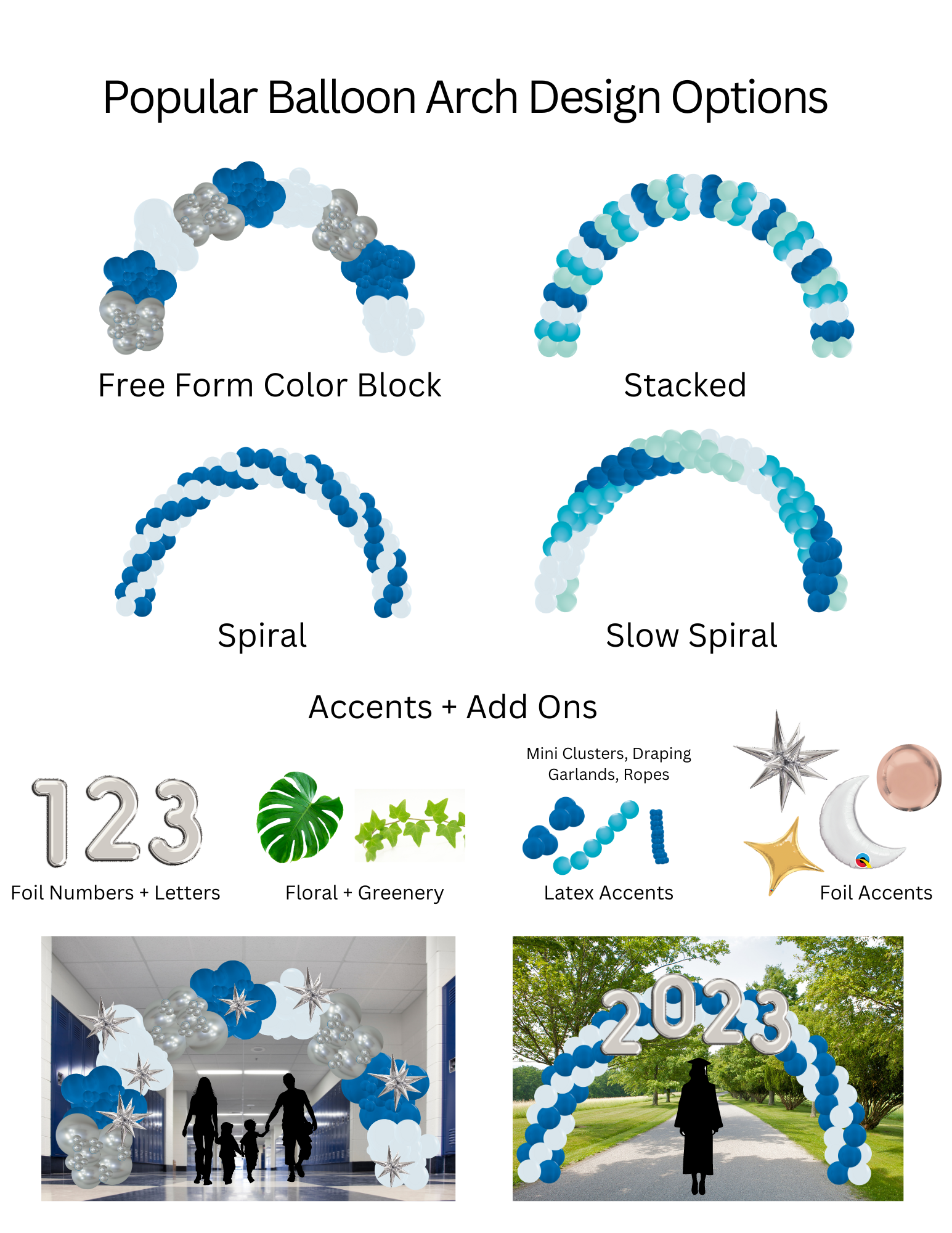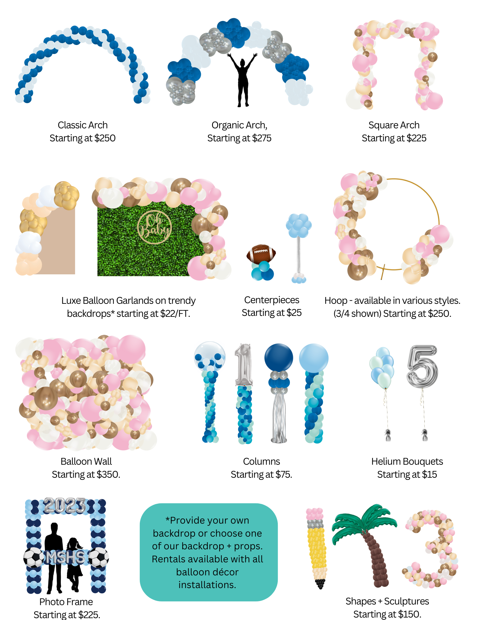 We offer a full line of balloon décor from classic arches and columns to extravagant organic balloon displays. Check out or list of popular products and starting prices. Don't see what you're looking for? No problem, we love custom designs!